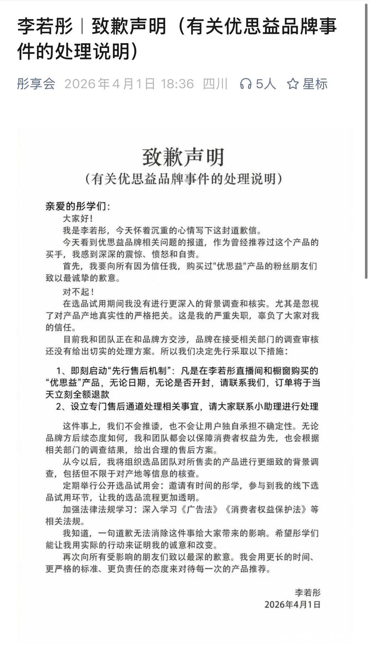 央视重磅调查直指“优思益”品牌涉嫌伪造进口资质,李若彤、明道等合作艺人迅速启动致歉与赔付程序,唯有长期以“责任为锚、情怀为帆”自诩的董宇辉,选择以静默删博的方式回避核心质疑。